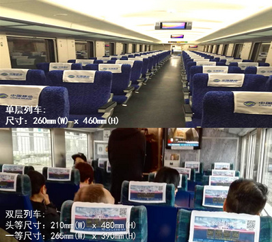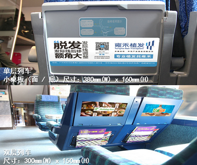 媒體形式:座位小桌板 車型:單層、雙層 媒體格式: 單層=380(w)x160(h)mm 雙層=300(w)x150(h)mm 媒體數(shù)量:677對/單層列車,732個/雙層列車 媒體報價:26萬元/4周/列 |