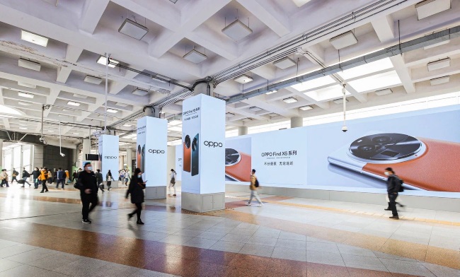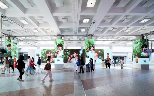 北京地鐵西直門站換區(qū)域電子連廊LED大屏廣告封閉連廊迫使乘客主動探索視覺信息,超常規(guī)尺寸,形成連廊空間視覺軸心,10米視距下占據(jù)60°水平視野,畫面沖擊力相當(dāng)于6塊標(biāo)準(zhǔn)燈箱聚合體;4根包柱屏構(gòu)成環(huán)形火力網(wǎng),每柱4面屏合計(jì)16個(gè)播放單元,徹底封堵視覺回避路徑。廣告信息接收深度較開放空間提升400%。換乘行為觸發(fā)獨(dú)特心理窗口,步行動線期平均主動注視時(shí)長12秒,信息焦慮催生廣告凝視需求。