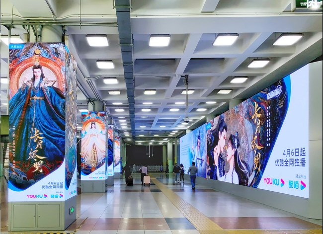媒體形式:換乘區(qū)墻面超級LED*1塊+4面包柱電子屏*4根