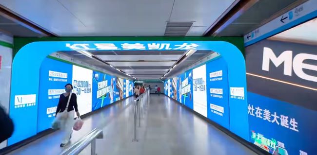 南京地鐵南京站換乘通道墻面廣告多媒體組合視覺統(tǒng)治力,4塊LED屏支持視頻內容,在昏暗通道中形成強光效焦點,8塊燈箱沿通道線性分布,構建"視覺長廊",3座拱門結構強化區(qū)域過渡感,自然分割不同廣告內容板塊。針對1號線轉3號線、3號線轉1號線雙向客流,多媒體組合確保各方向乘客均能接觸2-3個廣告點位。