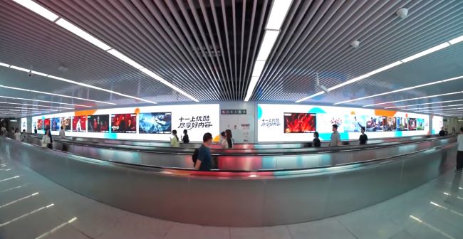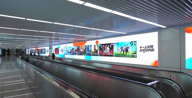 杭州地鐵創(chuàng)景路站A出入口通道墻面超長(zhǎng)LED大屏廣告形成一種包裹感和視覺上的連貫性。當(dāng)乘客穿行通道時(shí),廣告畫面可以伴隨其行進(jìn)軌跡,帶來更強(qiáng)的視覺沖擊和沉浸感。LED屏幕支持動(dòng)態(tài)視頻播放,相比靜態(tài)燈箱,色彩更鮮艷,表現(xiàn)力更強(qiáng)。這種形式非常適合展示品牌高端形象或進(jìn)行產(chǎn)品故事的生動(dòng)講述,其逼真的視覺效果能顯著提升廣告的關(guān)注度和記憶度。
