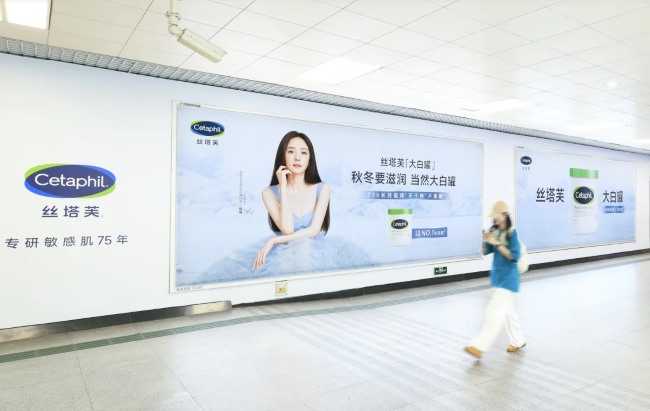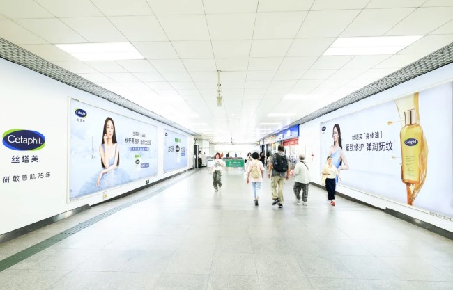 廣州地鐵體育西路出入口通道兩側(cè)墻面廣告設置于A出口通道兩側(cè)墻面,正處于乘客進出站行進動線的核心位置。一體化的設計幾乎占據(jù)了通道內(nèi)主要的可視墻面,形成了強烈的視覺包圍感。超級燈箱在通道照明環(huán)境下,其內(nèi)置光源能使畫面保持較高的視覺亮度和色彩飽和度,從而在相對封閉的通道空間中成為突出的視覺焦點。三塊超級燈箱與連續(xù)墻貼的組合,構(gòu)成了規(guī)?;恼故娟嚵?,能夠?qū)νㄐ谐丝彤a(chǎn)生持續(xù)的視覺影響,有助于品牌形象的統(tǒng)一和強化。